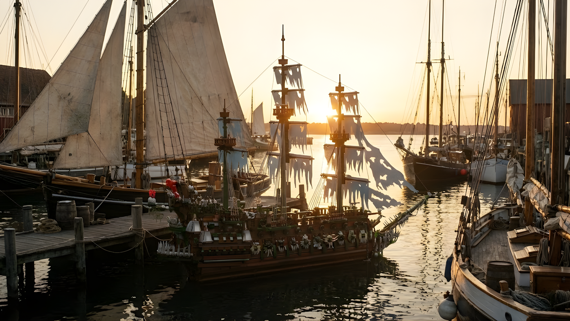 Die Segel, gefertigt aus Spezialgewebe mit einer zerrissenen und verwitterten Optik , vervollständigen die gespenstische Atmosphäre.