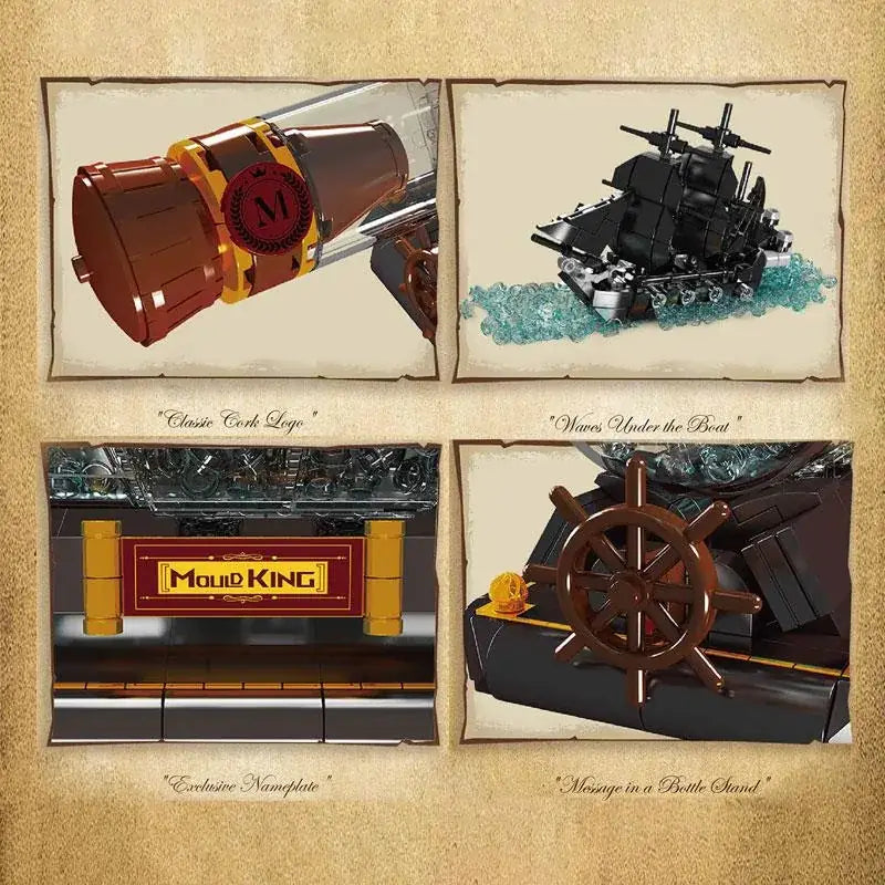 La Mini Black Pearl in a Bottle è stata progettata per impressionare nei dettagli. La nave, assemblata pezzo dopo pezzo all'interno della bottiglia trasparente, crea un contrasto raffinato tra lo scafo scuro, le vele cupe e la brillantezza cristallina delle pareti di vetro.