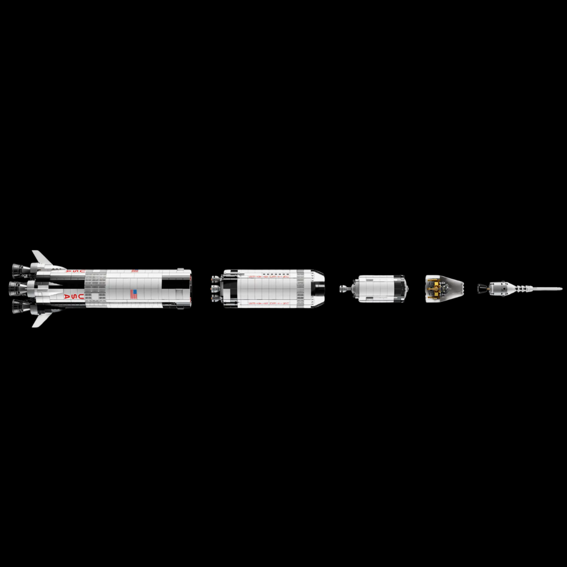 Ta miniaturowa rakieta jest w pełni modułowa, umożliwiając oddzielenie stopnia 1, stopnia 2, stopnia 3, modułu księżycowego oraz modułu dowodzenia, dokładnie tak jak miało to miejsce w rzeczywistej misji.